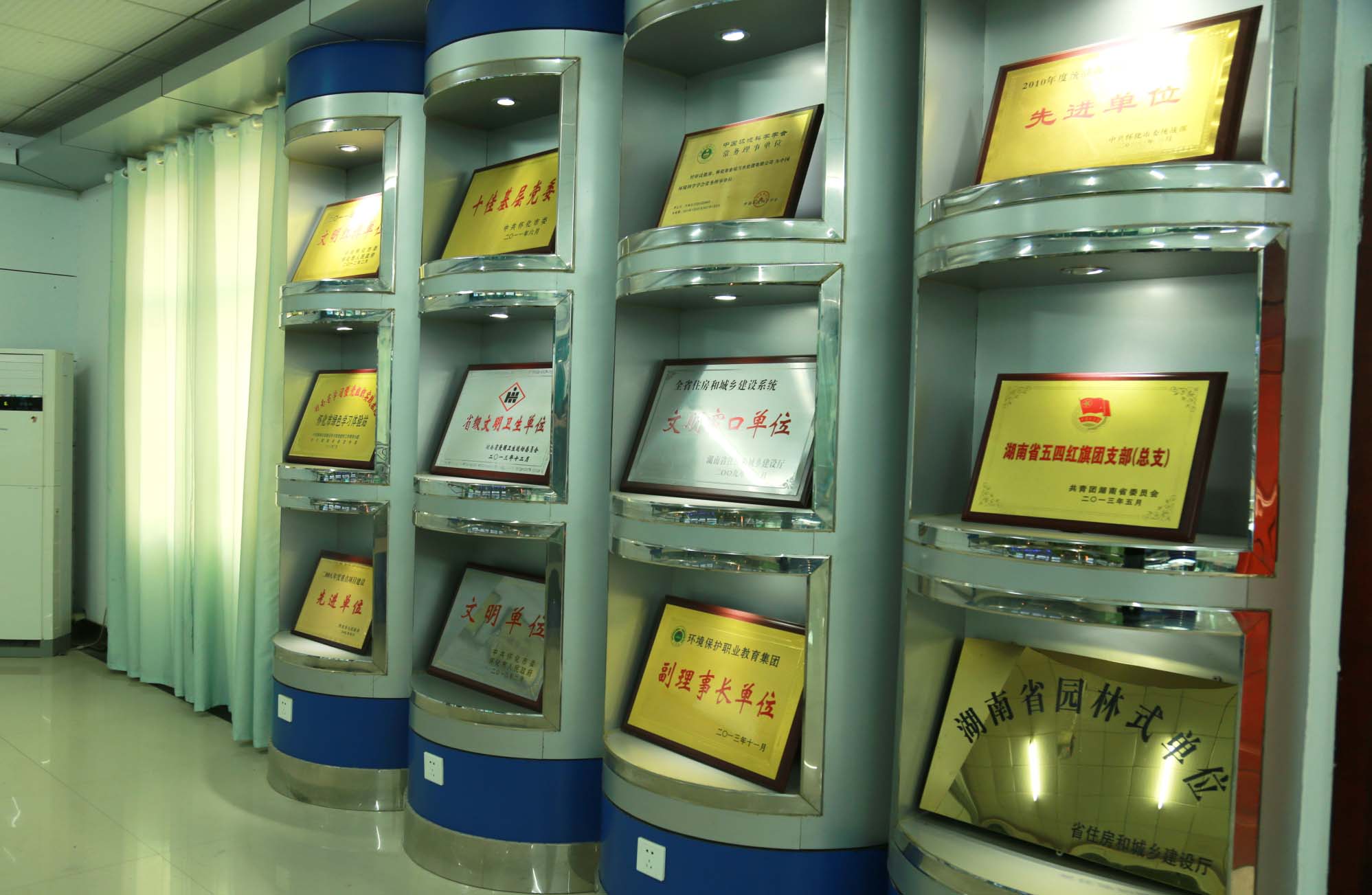 展览厅分为四个部分,一是水环境保护的宣传,二是平面布置实体模型,三是公司党委历年获得的部分荣誉展示,四是进出水样。
